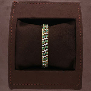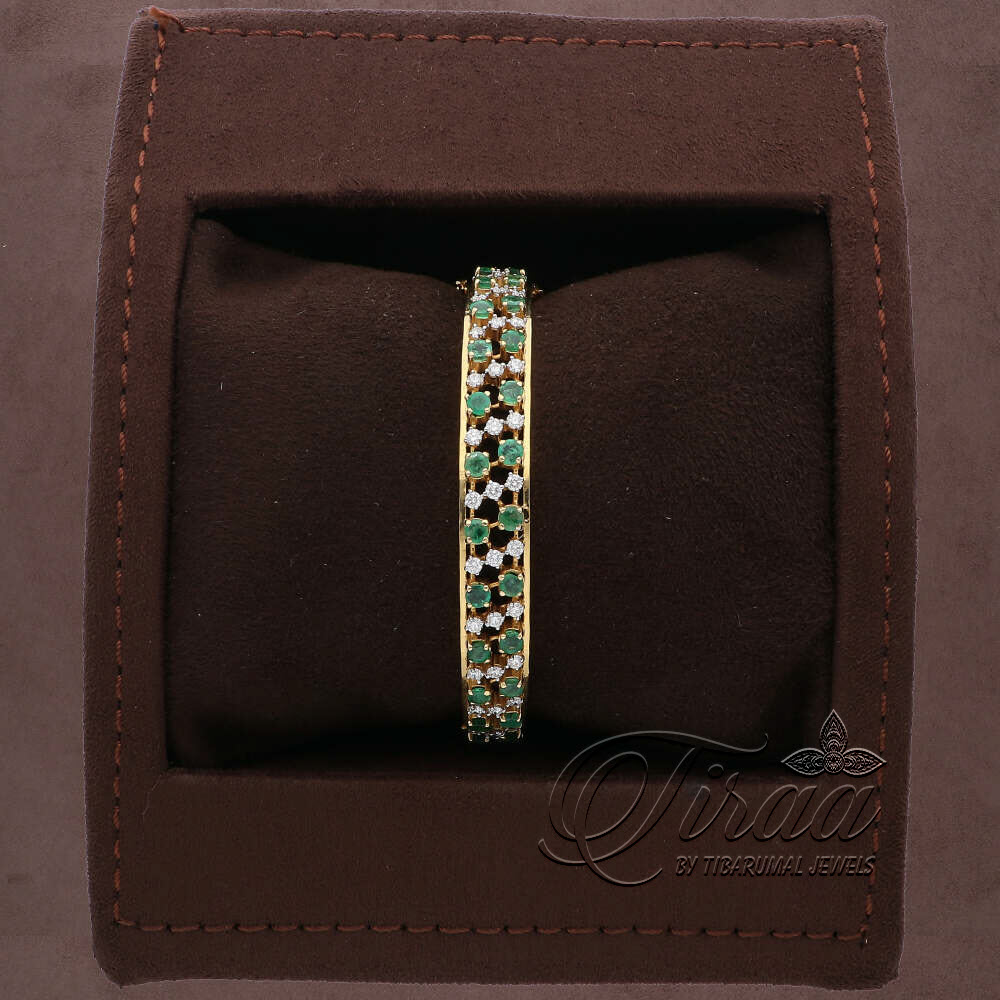 Looking for a statement piece to elevate your outfit? Check out our diamond-round bangle with beautiful emerald. It's perfect for formal occasions or adding some extra sparkle to your everyday look.