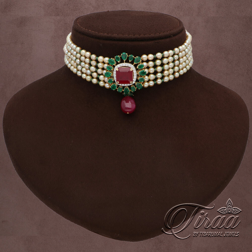 Studded with Round diamonds, Semi Precious stones and Strung with Emerald beads and South sea pearls.