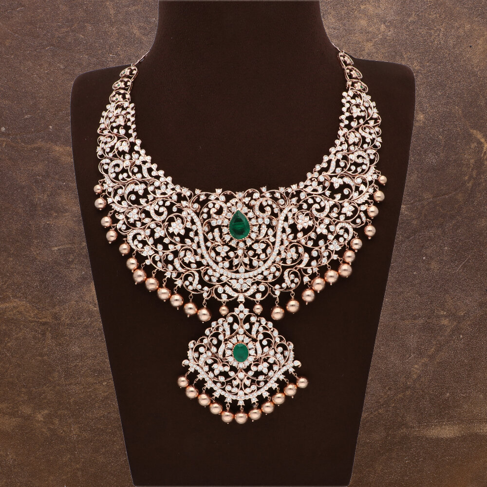 This masterpiece necklace is crafted with intricate details, featuring round diamonds elegantly studded throughout its length. Adorned with gold balls and pearls, it exudes sophistication and undeniable luxury.