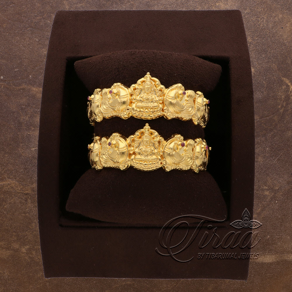 Step into the world of opulence and grace with these gold bangles adorned with exquisite craftsmanship. Our Deep Nkshi Peacock and Goddess Lakshmi engraved designs will make heads turn, bringing you the perfect blend of elegance and divine beauty. Indulge in the splendor!