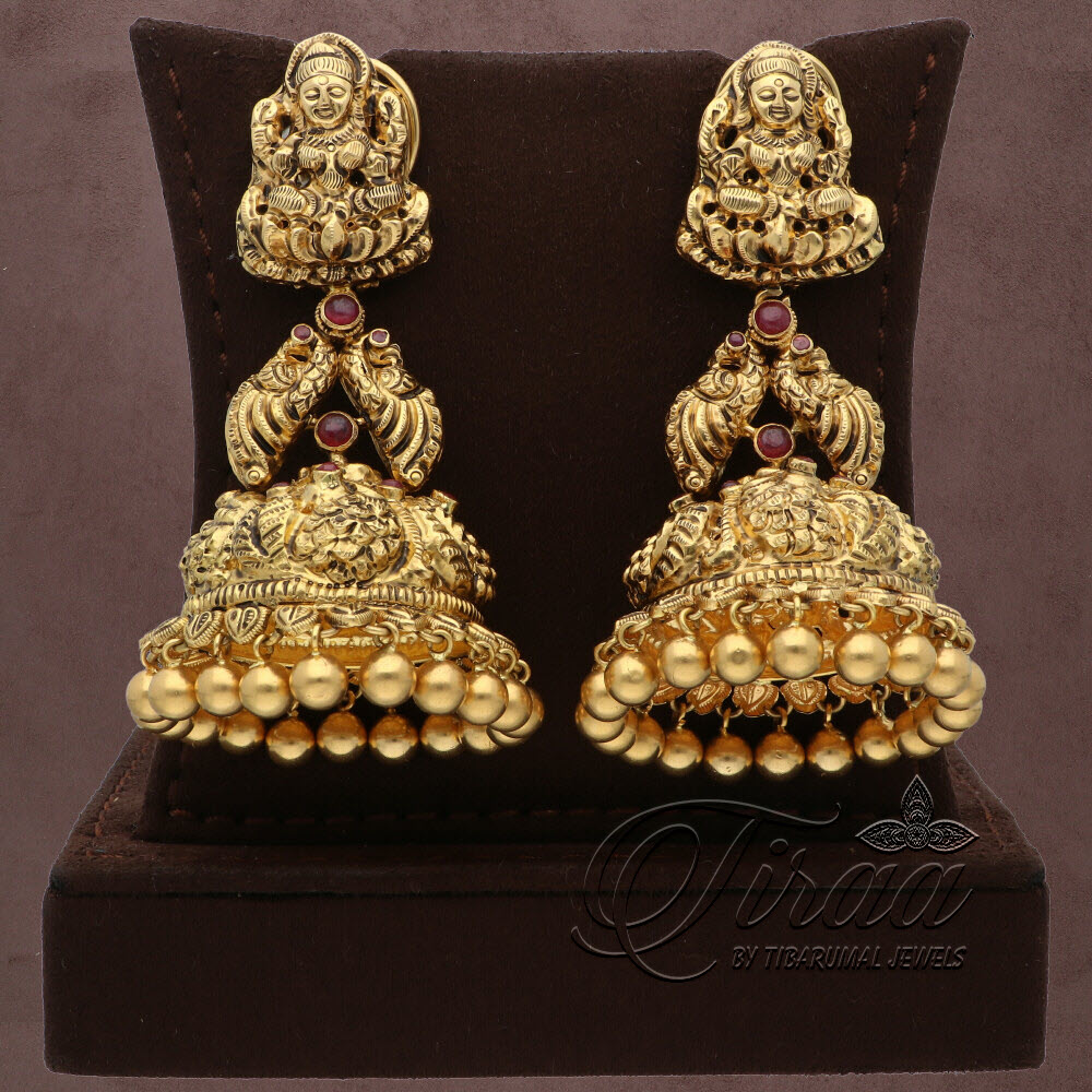 These gold jhumkas are a true work of art with their deep engraved nakshi detailing and symbolic depiction of the revered goddess Lakshmi Devi. The peacock design adds a playful touch while the gold balls provide a classic finish.