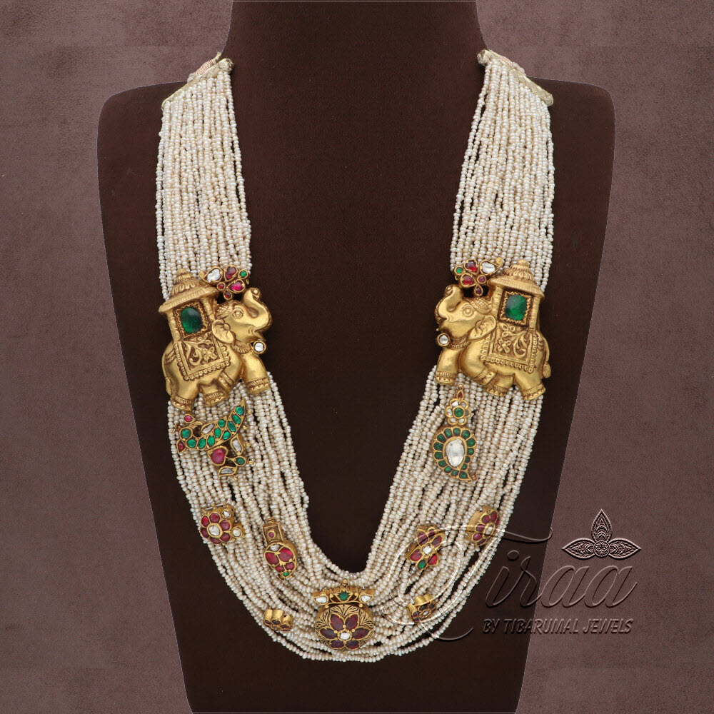 Studded with Flat diamonds, Emerald potas, Ruby potas and Strung with Pearls.