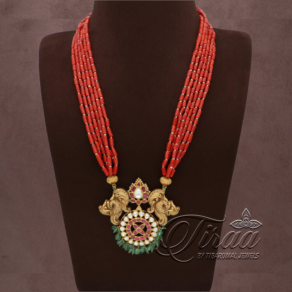 Studded with Flat diamonds, Emerald potas, Ruby potas and Strung with Emerald beeds, Corals and Pearls.