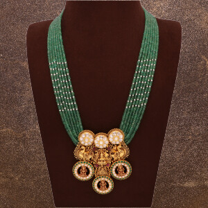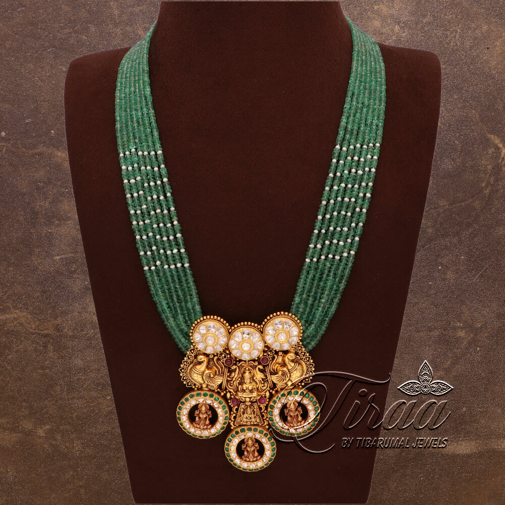 Gold engraved with deep nakshi work with peacocks and with goddess lakshmi devi and Studded with flat diamonds, Emerald potas, and ruby potas and strung with emerald beads and pearls.