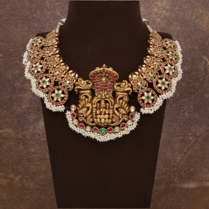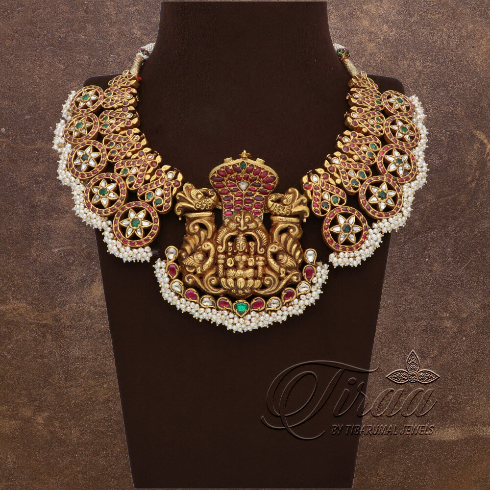 Gold engraved with goddess Lakshmi Devi, Studded with, Flat diamonds, Ruby potas, Emerald pots and Lined with bunch of pearls.