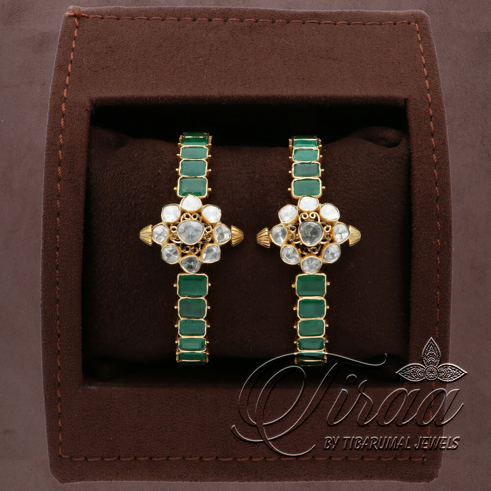 "Step into a blend of chic and charm with our uncut bangles. Gleaming with Flat diamonds and vibrant Zambian emeralds, they're sure to be the talk of the town!"
