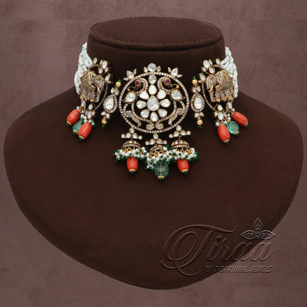 Redefine elegance with our Uncuts Chokers - radiantly set with precious diamonds, flat diamonds, and color stones. The string of emerald beads, pearls, and corals certainly seals the sophisticated look.