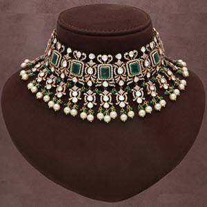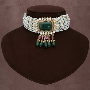 We love a good choker, especially when it's dripping in diamonds and pearls! This flat diamond studded piece is the perfect combination of classic and chic, and the added pop of emerald green is just the cherry on top along with cultured pearl..