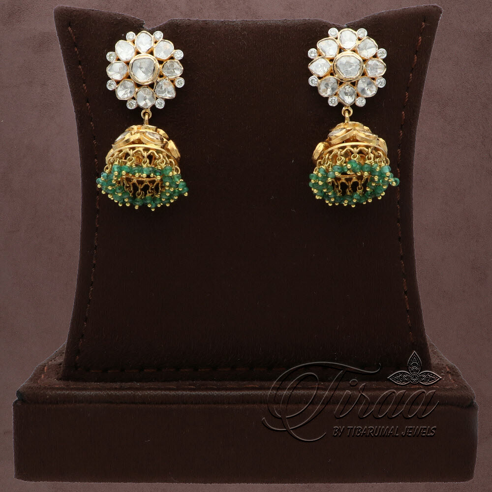 Fall in love with our elegant, uncut jhumkas! Studded with Round and Flat Diamonds, these radiant pieces will uplift any outfit. The jhumkas are further adorned with emerald beads, adding a touch of natural beauty. An ideal gift for the special lady!