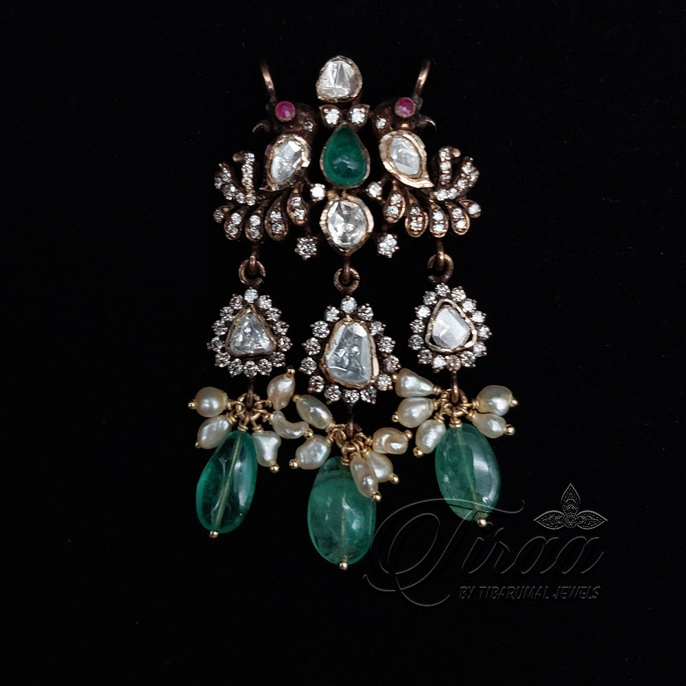 "Wrap yourself in luxury with our studded diamond locket - flat diamonds shine in the sun, while emerald and ruby adds depth. Strung with KC pearls and emerald beads, this locket is a statement piece for any outfit."
