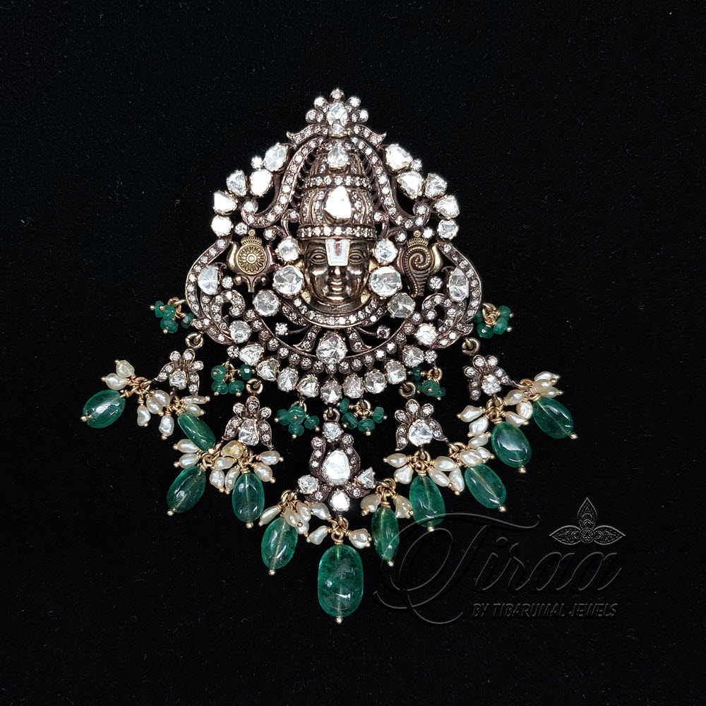 Elevate your look with our diamond locket strung with KC pearls. The combination of these two traditional features results in a new and modern style that will make an impact. This item, crafted with extraordinary attention to detail using emerald beads, is a must-have in any jewellery collection.