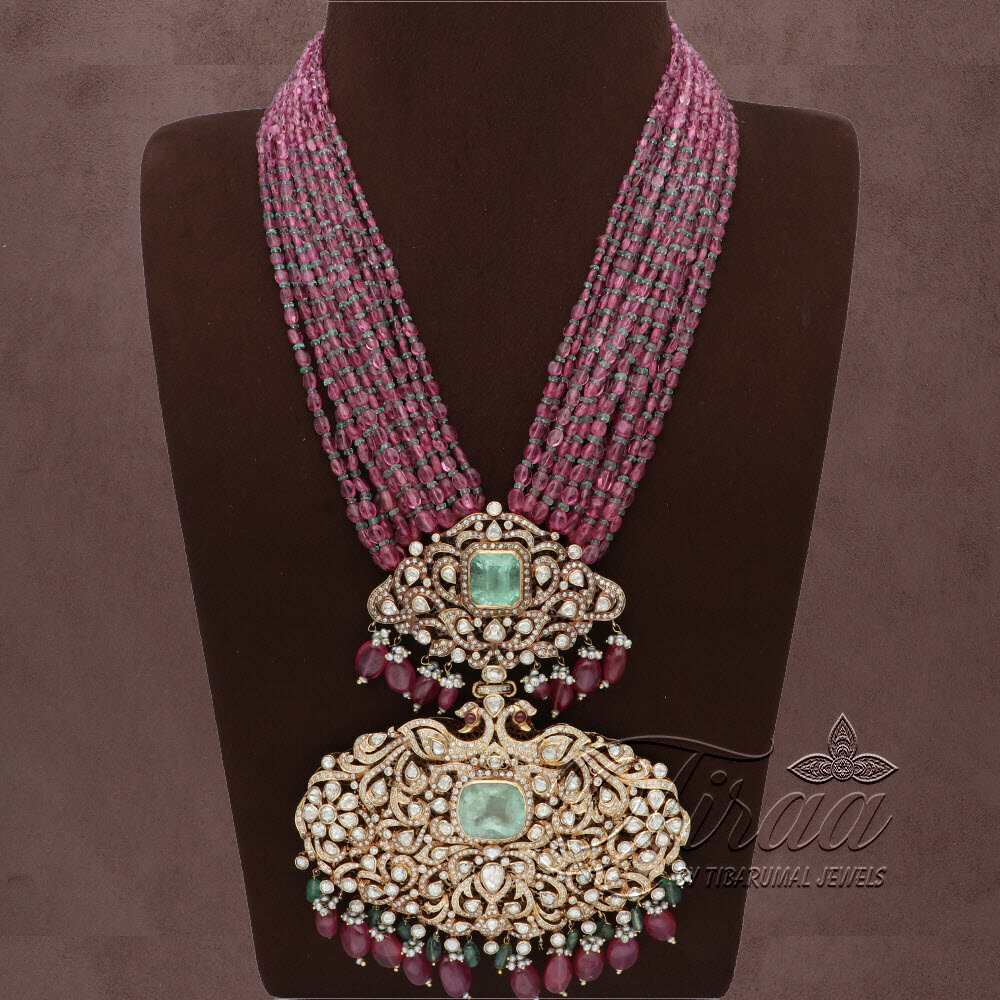 Studded with Diamond rounds, Rose cut diamonds, Emeralds, Ruby beeds, Emerald beeds, Pearls and Turmalin beeds.