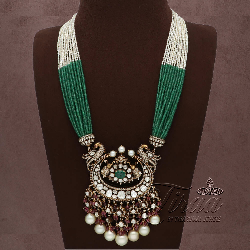 Purity 18K  Flat Diamonds 8.65 cts, Diamonds 9.52 cts, Emerald 3.99 cts, Emerald beads 132.95 cts, South sea pearls 222.75 cts, Tourmaline beeds 33.00 cts.